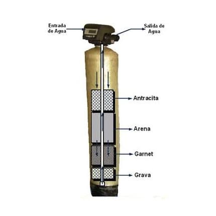 En general se utiliza antracita, granate y arena, acomodados de arriba hacia abajo en ese orden. En la base se coloca grava como soporte de los demás medios filtrantes. Luego de un ciclo se retrolava el filtro con agua a un caudal un 20-25 % mayor que el caudal de circulación normal, para permitir que durante el lavado el lecho se expanda y se reacomoden los medios filtrantes. También se puede inyectar aire en el tanque desde la parte inferior para aumentar la turbulencia y acelerar la expansión del lecho. Los ciclos pueden durar entre 12 y 24 horas (autonomía) dependiendo del diseño del filtro, y los retrolavados duran entre 15 y 60 minutos; durante ese tiempo no se produce agua filtrada, por lo que es recomendable, en caso de necesitar una provisión ininterrumpida de agua, contar con un tanque de almacenamiento de agua tratada para abastecer al proceso posterior.